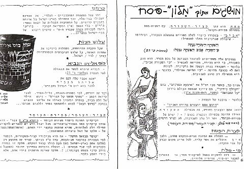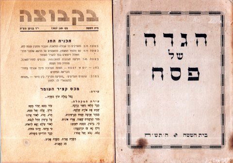 הגדה קיבוצית לפסח -באדיבות אתר נוסטלגיה בעריכת דוד סלע הגדה קיבוצית היא כינוי כולל לשלל הגדות “מחודשות” לליל הסדר של פסח, שיצאו לאור בעיקר (אך לא רק) בחוגי התנועה הקיבוצית בארץ ישראל. הגדות אלו אמנם מבוססות בחלקן על ההגדה המסורתית, היא ההגדה של פסח, אך מופיעים בהם גם טקסטים ואיורים חדשים, ובראשם אזכורים לאירועים מן האקטואליה של היהדות והציונות במאה העשרים, וכן הדגשת חג הפסח כחג חקלאי המסמל את האביב. המצווה העיקרית שאותה ראו מנסחי ההגדה הקיבוצית לפסח לנגד עיניהם היא “והגדת לבנך”; לפיכך ההגדה בנויה באופן שמספר אכן את סיפור יציאת מצרים, אך גם את סיפור הגאולה הציונית. ההגדה הקיבוצית של הקיבוץ הארצי – השומר הצעיר היא הגדה משותפת לכל קיבוצי הקיבוץ הארצי. ההגדה מופיעה באותה מתכונת, עם ציוריו של שמואל כץ משנת 1964. ההגדה נחלקת לארבעה “שערים”: אביב, יציאת מצרים, גאולה ותקומת מדינת ישראל, השלום. בשער האביב מצויים קטעי קריאה משיר השירים: “הנה הסתו עבר..” (שיר השירים ב’) ו”נצא השדה..” (שיר השירים ז’), והפיוטים: “גשם חלף וסתו עבר… בוא בשלום טל” המיוחס ליוסי בן יוסי או לאליעזר הקליר, “הלילה הזה כל העולם כולו אומרים בו הלל ואוצרות טללים נפתחים בזה הלילה” (פרקי רבי אליעזר), מספר פרקים מתפילת הטל של אליעזר הקליר החל מ”טל צווה שנה טובה ומעוטרת”, שירו של משה אבן עזרא: “כתנות פסים לבש הגן…” ושירו של מתתיהו שלם, “שיבולת בשדה”. שער הסיפור ביציאת מצריים מתחיל במה נשתנה, הא לחמא עניא והשיר העממי “עבדים היינו” המסורתיים ולאחרים מספר פרקים מספר שמות (ארוכים יותר מהקיים בהגדה המסורתית) המספרים את סיפור יציאת מצריים ומזכירים את הנהגתו של משה רבנו (הנעדרת מההגדה המסורתית), עשר המכות ודברי רבן גמליאל: על “פסח, מצה ומרור”. לכך נוספים קטעי קריאה מודרניים משלימים כשיר מתי מדבר האחרונים של חיים נחמן ביאליק וקטע מ”במדבר” של דוד פרישמן: “לך, בוא מצרימה ובאת אל הנענים והאומללים, אל כל הנאנחים והנדכאים, ואמרת אליהם כי עבדים הם – והם לא יבינו; ואמרת אליהם כי אומללים הם – והם לא יידעו; וכי גדול עוניים וגדולים מכאוביהם ונורא לחצם – והם לא יאמינו; ופקחת את עיניהם בחוזק יד על כל לחצם ועל כל עונים –וגאלת אותם”. סיפור יציאת מצריים מסתיים בשירת הים ובמילים, שהן פרפראזה על הנוסח המסורתי: זכור את היום הזה אשר יצאתם בו ממצרים מבית עבדים. כי בכל דור ודור חייב אדם לראות את עצמו כאילו הוא יצא ממצרים, לא אבותינו בלבד, אף אנו נגאלנו עימהם כי בכל דור ודור עולה זעקת ישראל ושוועת העשוקים תחת יד משעבדיהם ובכל דור ודור יחמר חרונם לפרוק עול. ובכל דור ודור תפרח תקוות אביב חדש חיים חדשים תקוות השחרור והתחייה. שער הגאולה והתקומה מקשר בין גאולת מצריים לבין התקומה הציונית שגולת הכותרת שלה הקמת הקיבוץ ושיקומו על ידי עולים פליטי השואה. במהדורת 1964 נמצאים בחלק זה הפסוקים “זכור את אשר עשה לך עמלק”, שיר הפרטיזנים, מגש הכסף, יזכור ושירו של יהודה הלוי “ציון הלא תשאלי”. במהדורת 1986 חלק זה מצומצם יותר ואינו כולל את שיר הפרטיזנים, את מגש הכסף ואת היזכור. שער השלום כולל את נבואת הנחמה: “הגפן תיתן פריה והארץ תתן יבולה” (זכריה ז’), “והיה באחרית הימים וכיתתו חרבותם לאיתים…” (ישעיהו ב), שיר המעלות, “שאי סביב עינייך וראי: כולם נקבצו באו לך” (ישעיהו ט’), “הנה ימים באים ונגש חורש בקוצר…” (עמוס ט’). במהדורת 1986 נוסף שיר השלום מאת יהודית כפרי “פעם תהיה אהבה גדולה”. ההגדה מסתיימת בחד גדיא. ברכות ארבע הכוסות אף הן זכו לנוסח חדש, המתאים לפרקי ההגדה ולרוחה, שואב ממסורות אך מהווה יצירה מקורית: כוס ראשונה: “כוס ישועות נישא ליציאת ישראל מגולה לגאולה משיעבוד מלכויות לקוממיות בארצנו לחיים ולישועה!” כוס שניה: “כוס גאולה נישא לניתוק מוטות עבדות במלוא תבל לפדות עמלים לחיים ולגאולה!” כוס שלישית: “כוס נחמה נישא לשלום שארית ישראל ולשלום העמים יהי שלום ב
