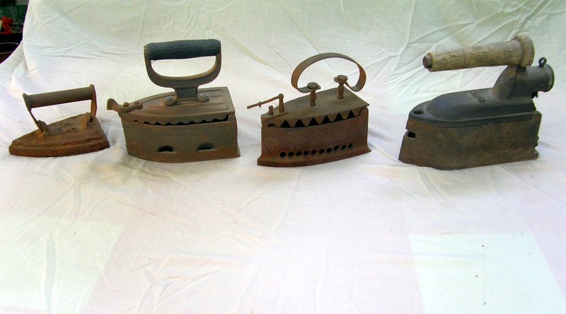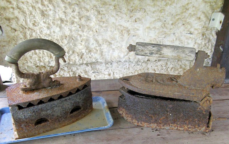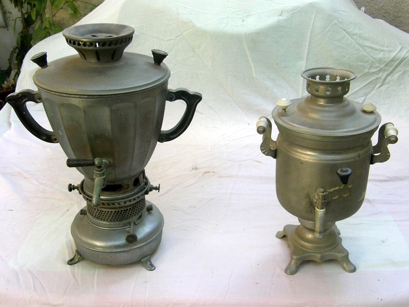 מגהצים מופעלים בפחם או מחוממים על תנור היו שיא השיכלול בטרם המצאת חדר התגמיר. משמאל: הסמוברים לחימום מים והכנת תה הגיעו עם העולים מרוסיה והמזרח והיו נושא להתפארות במילייה המקומי.
