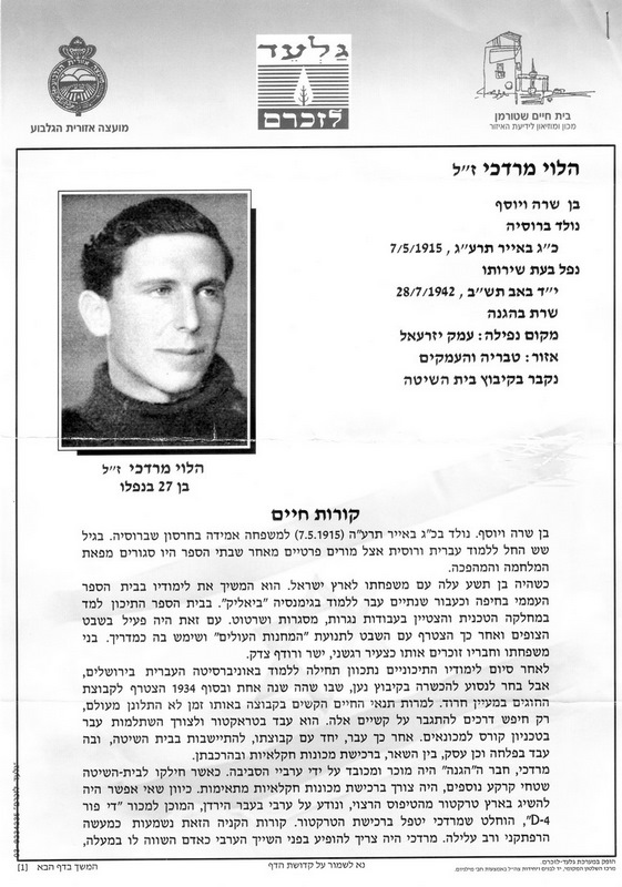 מרדכי היה החלל השני בבית השיטה וכמו רבים אחרים היה פלח ונוטר בשדות העמק עד מותו.בית שטורמן הנציח את כל חללי העמק בגלעד לזיכרם.