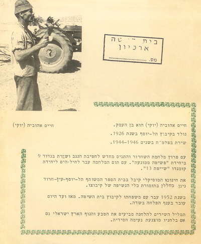 חיים אהוביה, בכינויו יוקי, נולד בקיבוץ תל-יוסף, בו גדל והתחנך והזדהה עם הקיבוץ וערכיו. יוקי כלוחם, בשנת 1944, התגייס לפלמ”ח והשתתף בפיצוץ גשר אלנבי. נלחם בכל מבצעי חטיבת הנגב והשתתף בשחרור באר-שבע. עם תום מלחמת השחרור גוייס כלוחם מצטיין לשייטת 13 ושירת שנים רבות במילואים בשייטת.